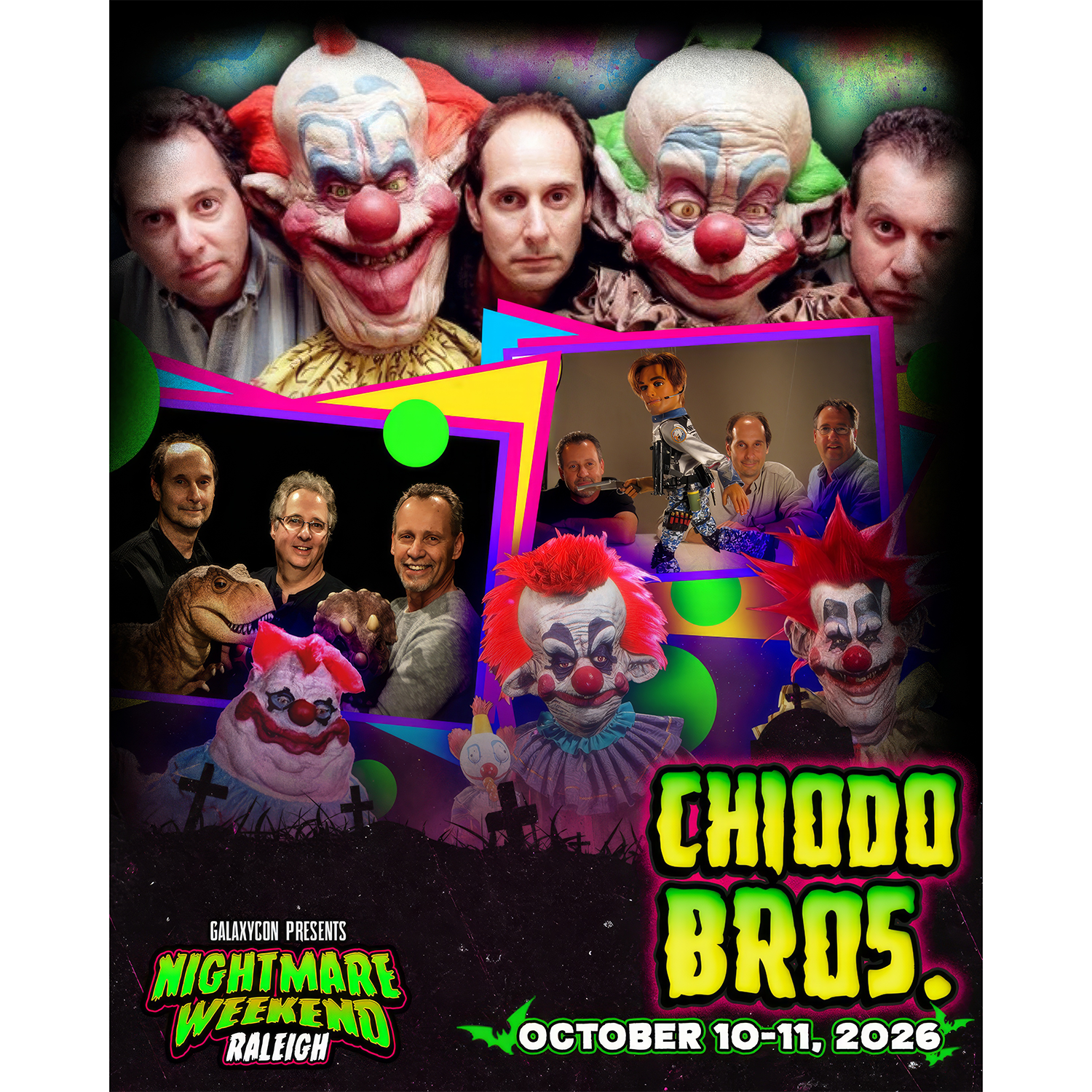 As an official Nightmare Weekend Raleigh Autograph Service partner, Fénix Autographs is delighted to offer our send-in service for your personal items as well as guest-provided photo options to be signed by Charles, Edward, and Stephen Chiodo (aka Chiodo Brothers).